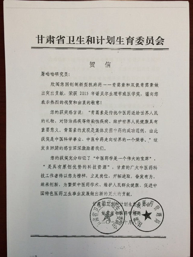 欣闻您因创制新型抗疟药——青蒿素和双氢青蒿素做出突出贡献,荣获2015年诺贝尔生理学或医学奖,谨向您表示热烈的祝贺和由衷的敬意!