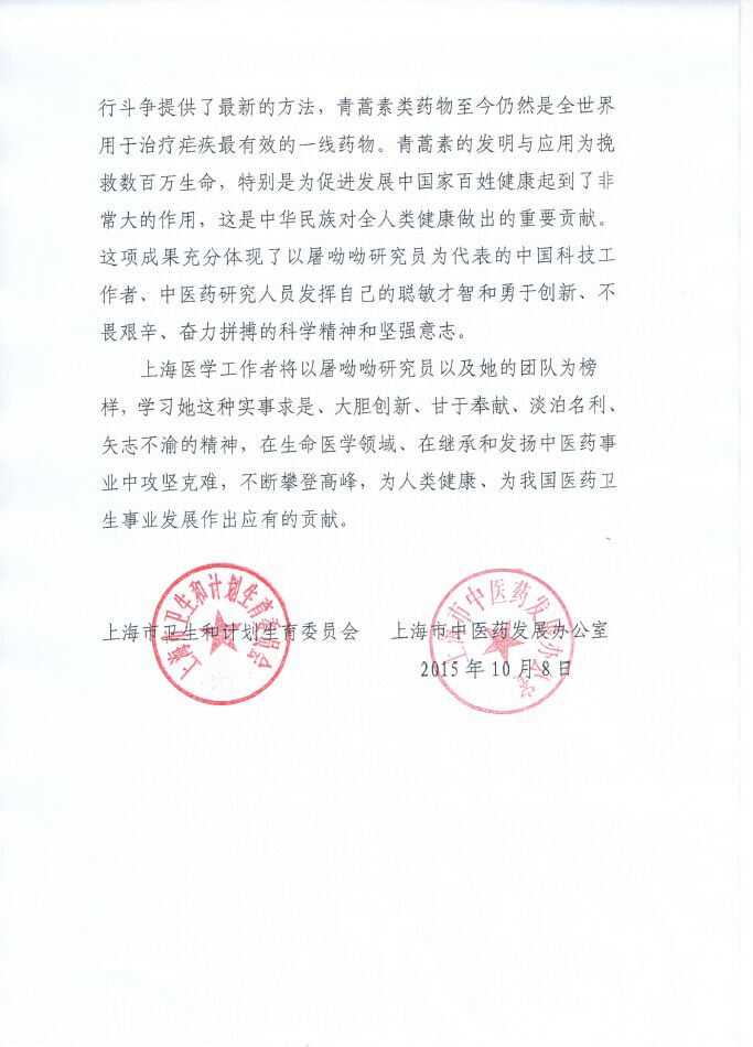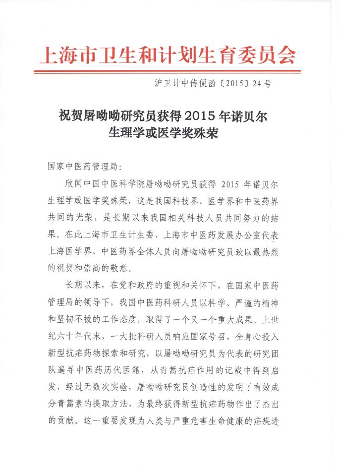 上海市卫生计生委、上海市中医药发展办公室贺信