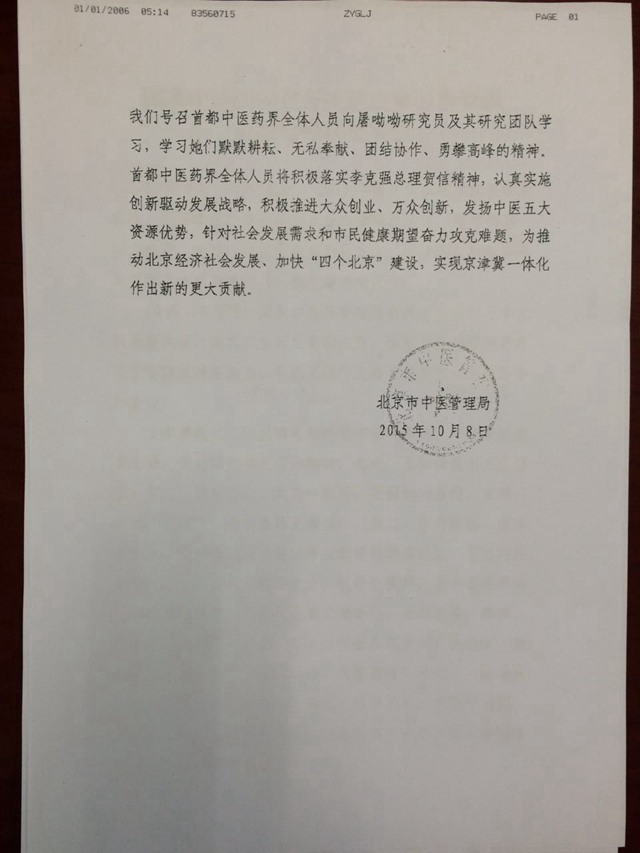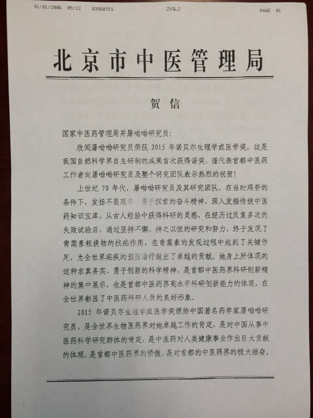 屠呦呦获得2015年诺贝尔生理学或医学奖