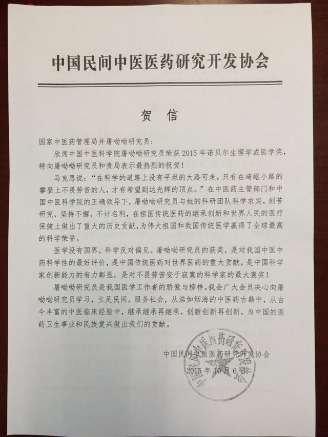 中国民间中医医药研究开发协会贺信