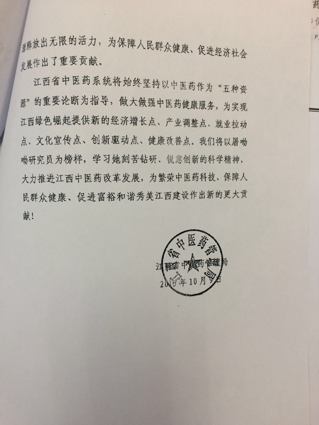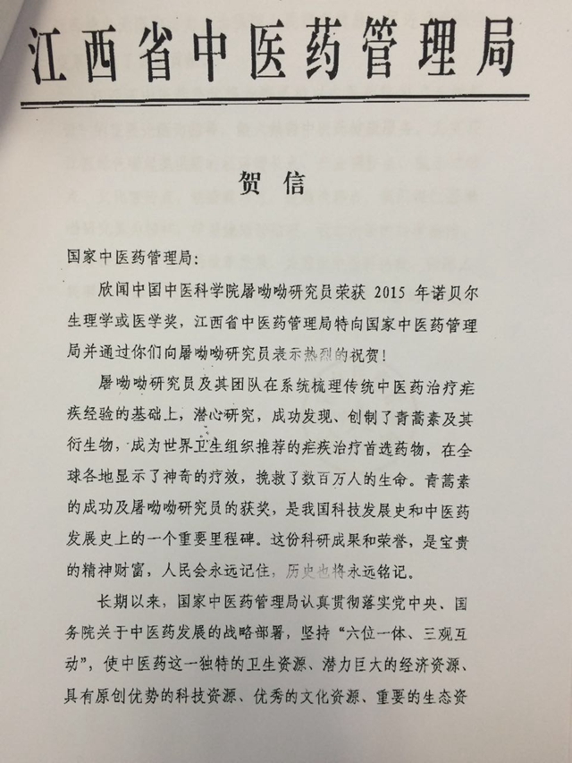 欣闻中国中医科学院屠呦呦研究员荣获2015年诺贝尔生理学或医学奖,江西省中医药管理局特向国家中医药管理局并通过你们向屠呦呦研究员表示热烈的祝贺!