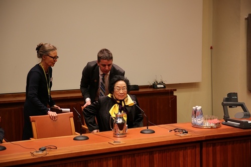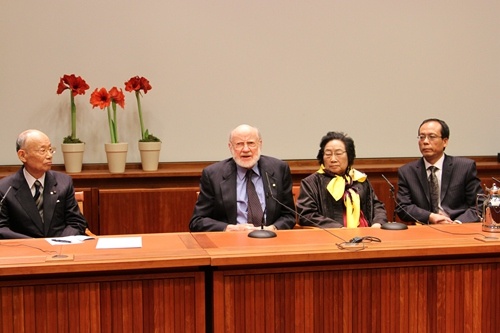13:30分后,记者已基本就位,各种“长枪短炮”架起在会场中心后,卡罗林斯卡医学院的在校学生被允许进入会场,只能容纳不到200人的诺奖大厅一下子座无虚席。13:58分,医学院新闻官安娜玛丽在现场轻轻的一句“他们来了”,全场立时鸦雀无声,随之进入会场的是大村智和威廉·坎贝尔。两人落座后。新闻发布会的主持人,诺贝尔生理学或医学奖评委会秘书长乌尔本·列达勒请大家等待屠呦呦几分钟。然后屠呦呦在翻译的陪同下,从大厅上方另一个入口慢慢走进。