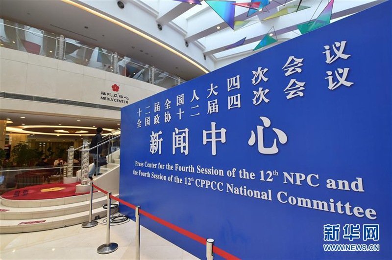 梅地亚中心内的两会新闻中心背景板。 新华社记者 李鑫/摄