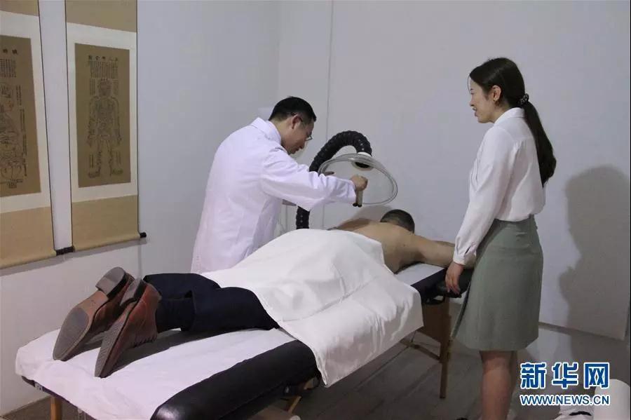 在葡萄牙里斯本,葡萄牙客人在欧洲(葡萄牙)中医药文化体验中心体验艾灸(9月4日摄)。新华社记者 温新年 摄