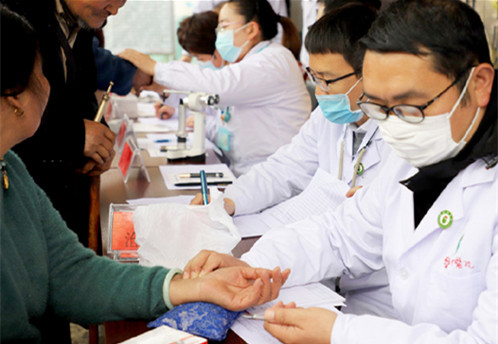 健康扶贫义诊活动现场巡诊医疗队队员为村民诊脉