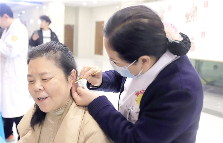 重庆市荣昌区中医院护士长为患者进行耳部刮痧