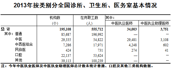 2013年按类别分全国诊所、卫生所、医务室基本情况