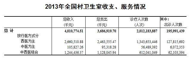 2013年全国村卫生室收支、服务情况