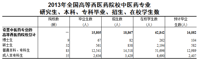 2013年全国高等西医药院校中医药专业 研究生、本科、专科毕业、招生、在校学生数