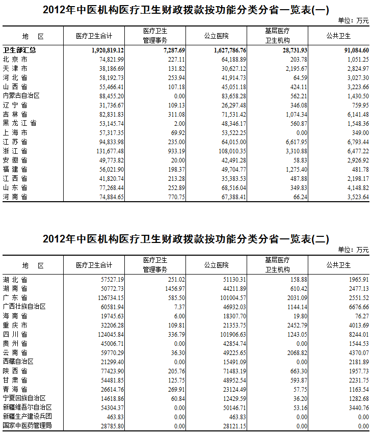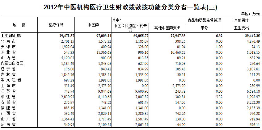 2012年中医机构医疗卫生财政拨款按功能分类分省一览表
