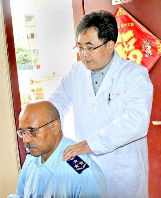 图为安哥拉空军司令阿方索上将接受中医治疗。 (本报记者 胡 彬 综合报道)