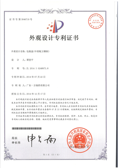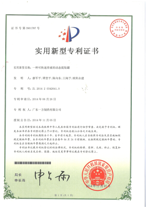 近期,国家知识产权局发文公告授权广东一方制药有限公司4项专利,其分别为两项发明专利“一种检测决明子配方颗粒中大黄酚含量的方法”和“一种改善中药配方颗粒喷雾干燥工艺的辅料组合及其应用”,实用新型专利“一种可快速排液的动态提取罐”,外观专利“包装盒(中药配方颗粒)”。2014年至今,一方制药围绕中药配方颗粒产业化研究及相关产业研究,累计获得发明专利授权3项,实用新型1项,外观专利1项。相关成果的应用与保护,将为一方制药进一步推进中药配方颗粒全面产业化,促进企业跨越发展,成就国内中药配方颗粒领导者奠定坚实的基础。