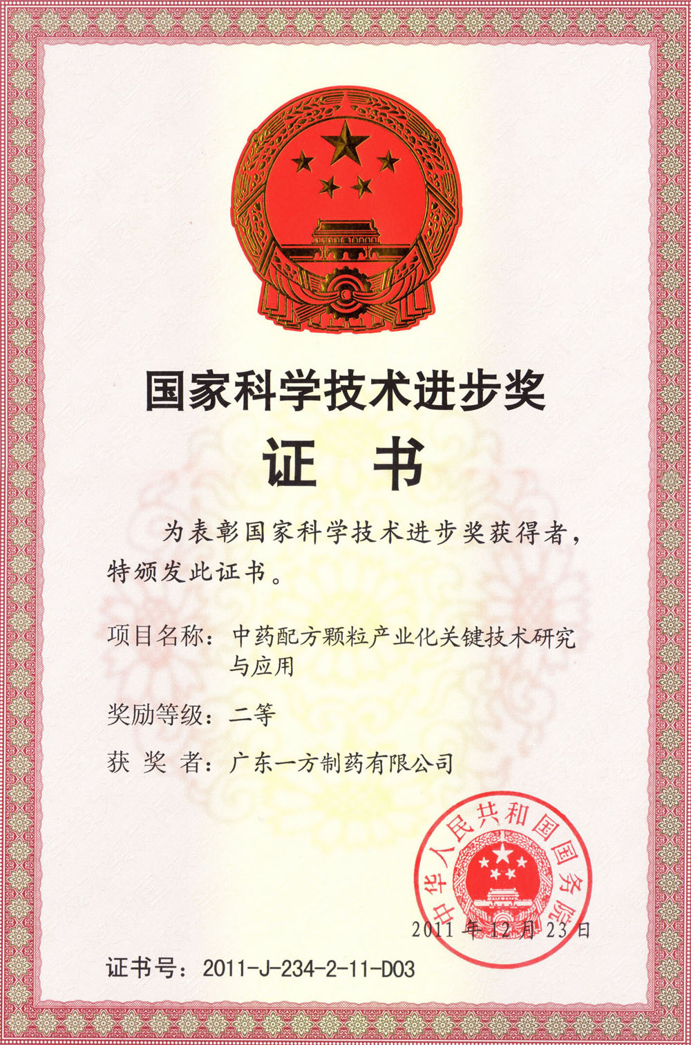 高新技术是企业发展的标签,也是企业的荣誉所在。2002年:广东一方制药有限公司成为“博士后科研工作站”。2010年:获得广东省科学技术一等奖。2011年:获得国家科技进步二等奖。2011年:获得广东省著名商标认证。2012年:广东省一方制药被评选为“国家火炬计划重点高新技术企业”。2014年:广东一方制药的中药配方颗粒被认定为广东省高新技术产品。一方制药以先进的技术,不断努力推进中药配方颗粒生产产业的前进,其成果惠及广大群众。