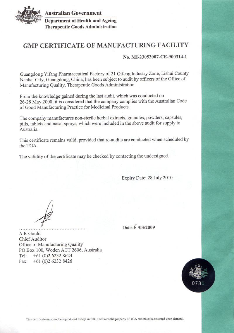 2009年5月,公司顺利通过澳大利亚TGA第五次GMP复认证