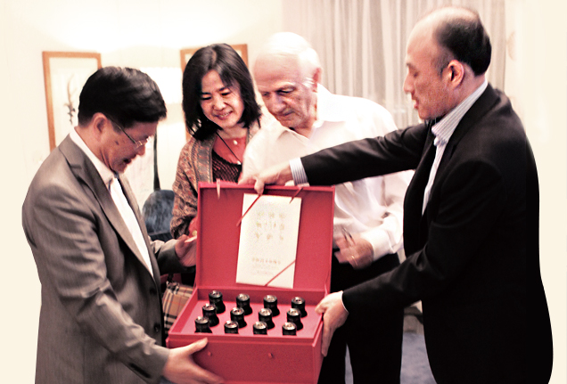 中外名人 匈牙利布达佩斯俱乐部主席欧文﹒拉兹洛访问江中集团,获赠并服用参灵草。