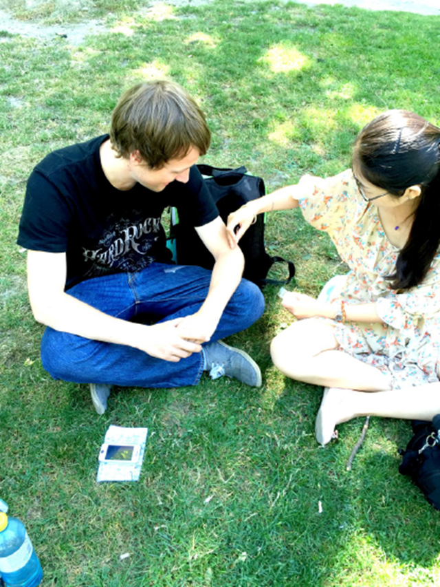 交流小组的领队Macros是个德国人,在见到他的第一天,同学们就对他做了关于中医药认知度的问卷调查,遗憾的是当时他对中医没有什么了解,仅仅听说过针灸,并且表示不愿意接受针灸作为辅助治疗手段。在一起学习、交流的一个月中,同学们常常向他介绍中医理论、演示针灸操作。在交流项目接近尾声时,Macros表示希望体验一次针灸治疗。同学们用一次性针灸针为他进行曲池穴针刺,Macros说感觉前臂都有胀、麻的感觉,觉得中医针灸很神奇,令他折服。