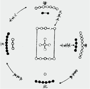 河图不仅描述了五行的生成,而且反映了五行间的相生关系。河图按顺时针方向旋转即为五行相生,即金生水、水生木、木生火、火生土、土生金。