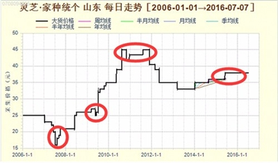 2012~2015年,灵芝的行情均在35元上下的价格波动,整体行情呈疲软态势。