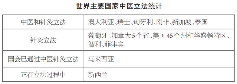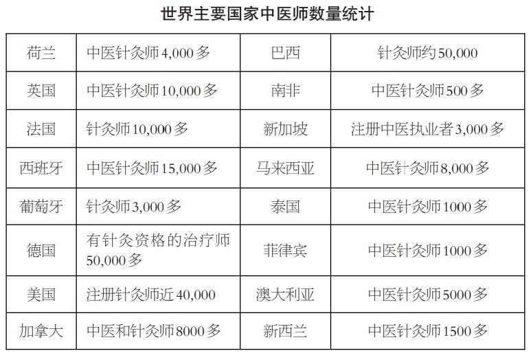 目前中医药在西方国家归属于替代医学或补充医学。据不完全统计,全世界(不包括中国)目前受过专业培训的中医药人员约50多万名。70%以上都是通过各国当地的业余中医学校培训或毕业,其中30%是西医医生;45%是理疗师、自然疗法治疗师、护士等;30%没有医学背景,5%是毕业于中国中医药院校的中医医生。他们中大部分自开门诊,60%以针灸治疗为主;30%针灸加中成药治疗;5%以中药饮片、中成药治疗为主;还有5%从事中医推拿或加针灸治疗,共有30多万家私人中医诊所。