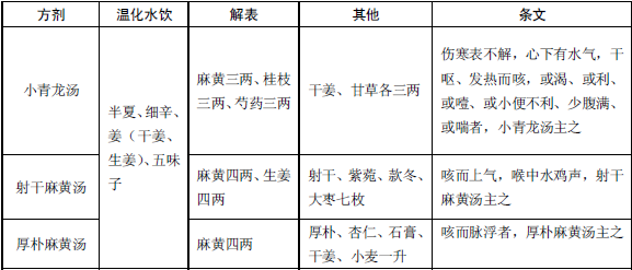 方药组成 以方测证来看,都有麻黄解表,半夏、细辛、姜(干姜、生姜)、五味子温中化饮,故皆属于太阳太阴合病的外邪里饮证。