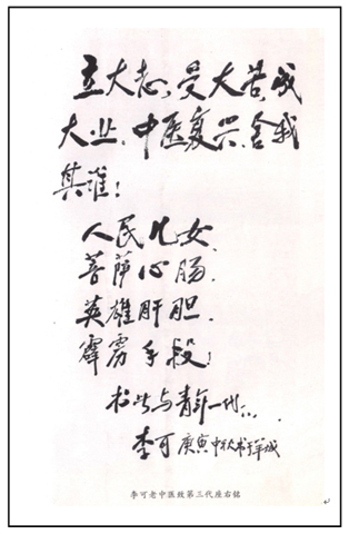 在广州市南方医院李可学术传承基地办公室的墙上,挂着一幅已故名老中医李可写的书法:“立大志,受大苦,成大业,中医复兴,舍我其谁;人民儿女,菩萨心肠,英雄肝胆,霹雳手段。”这既是勉励弟子的座右铭,也是李可的夫子自道,道出他的大医胸怀和中医情结。
