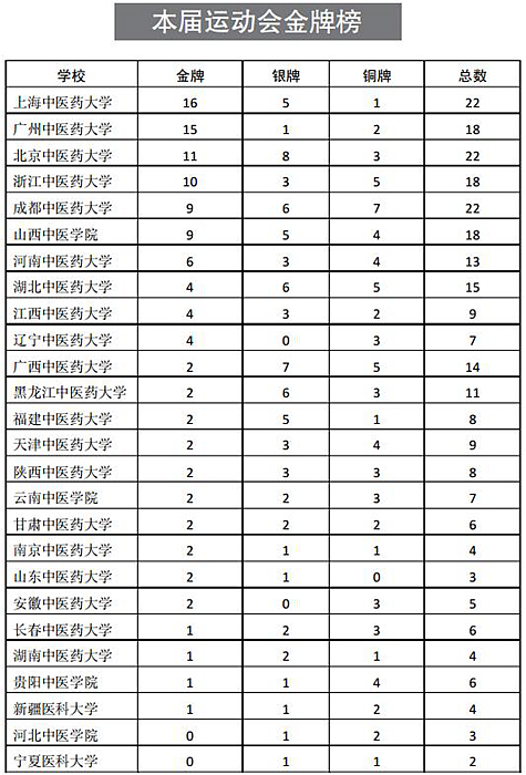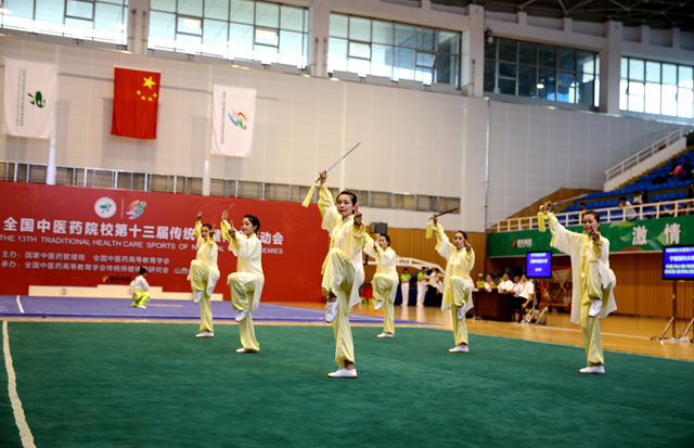 9月2日~6日,“振东杯”全国中医药院校第十三届传统保健体育运动会在山西中医学院举行。经过4天紧张激烈的比赛,上海中医药大学以16枚金牌、5枚银牌、1枚铜牌的成绩占据金牌榜榜首。在本届传统保健体育运动会上,传统保健体育运动项目的角逐让人眼前一亮,易筋经、八段锦、长拳、南拳、太极拳、刀术、枪术、剑术、棍术……赛场上运动员们英姿勃发,成为一道亮丽的风景线。