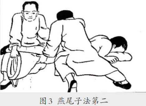 过伸压盆法 此法是指患者俯卧,术者将患侧下肢后伸,用肘按压骨盆髂嵴的手法,《中国接骨图说》称“燕尾法”:“燕尾子法第二:使患者侧卧如母法,插入叠被于裹帘所缚伤股间,佐者对立患者面前,两手持被前端,医右手斜合持补后端。而提举之,左手紧捺髀骨尖。回转如母法。其右手不及脚,只被中将送之也。亦要徐迟其曳也,乘势而复其位。”(图3)