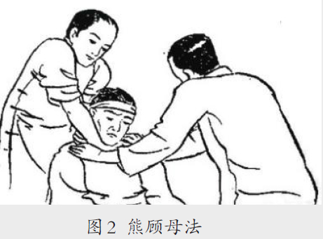 颈椎旋提法 此法是指将颈椎旋转并向外上方提起的手法,又称“颈椎旋转法”。此法最早文献记载是公元610年,隋朝巢元方的《诸病源候论·风病诸候》描述养生方导引法:“一手长舒,仰掌合掌。一手提颏,挽之向外,一时极势二七,左右亦然。手不动,两向侧势,急挽之,去颈骨急强,头风脑旋,喉痹,膊内冷注,偏风。”这是自我旋转颈椎的手法,其治疗疾病是典型的今天称之为“颈椎病”的症状。后来,明朝的《按摩导引养生秘书》绘图说明。《中国接骨图说》熊顾法,即是此法,言:“熊顾母法:使患者开两踵于臀外而安坐,医在其背后,践开两脚而直立,低头视患者之额上,安右手于额中央,翻左手以虎口挟持其项骨,指头用力把定发际玉枕骨下陷处,翻右手截其颐于掌上,前后相图。左手自肩用力提之,右手应左手之提,自下抬之,务勿不正左右齐一,令右顾三次,然后当患者头后于胸膛。以左手按额中央,翻右手拉持项骨,载颐于左手掌上如前。令左顾三次。”(图2)