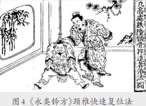 颈椎牵引法 此法是指用颈颌四头带牵引颈椎的方法,是颈椎病常用的手法。此法源自元朝《永类钤方》治颈椎骨折脱位,该书“风损伤折卷二十二”载:“凡摔进颈骨,用手巾一条,绳一茎,系在杠上,垂下来,以手巾兜下颏下方令脑后绷接绳头,却以瓦罂一个,五六寸高,看木凳浅深,斟酌高低,令患人端正坐其罂上,令伸脚坐定。医用手挼捺平正,说话不觉,以脚踢去罂子。在左,用手左边掇出;在右边右边掇出。又一法,令患人卧床上,以手挤其头,双足踏两肩即出。”后世《骨继疗法重宝记》据此文绘图示(图4),清朝胡廷光编《伤科汇纂》,将此法名“汗巾提法”。而法国人加利森(Glisson)吊带应用是17世纪。1937年Crutchfield才报道应用快速牵引复位颈椎骨折脱位。由于社会因素,导致医学界认为颈椎牵引是西医的发明,实际上“加利森吊带”较中国医学晚300多年。