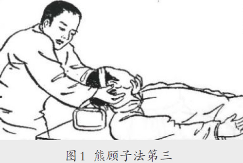 牵颈折顶法 此法是指取仰卧位,医者用手掌牵头颅,另一手沿颈椎推拿折顶的手法。此法源自《永类钤方》对颈椎损伤的“挼捺法”。元朝《回回药方》:“若脖项骨节脱了,其治法一人托向前,一人于骨节上缓揉令其软,然后入本处。”清朝《捏骨秘法》:“捏头项法(二条)凡脖错捩(伤跌),俱是向后错头,必俯而不直。治法:用左手托住前边,右手向疼处略稍按,按左手稍有知觉即止。”《中国接骨图说》名“熊顾子法第三”。(图1)