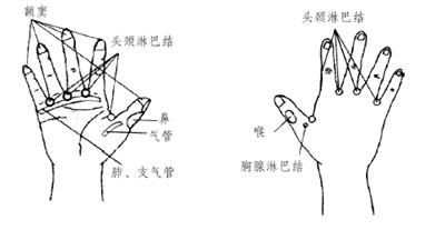 有效反射区 肺、支气管、鼻、喉、气管、头颈淋巴结、胸腺淋巴结等。