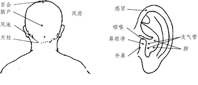 有效穴位 百会、脑户、风府、风池、天柱等穴,及支气管、肺、外鼻、感冒、咽喉、鼻眼净等耳穴(如图1)。