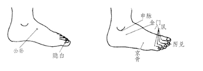 有效穴位 金门、申脉、京骨、公孙、隐白、厉兑等穴位(图7、图8和图9)。