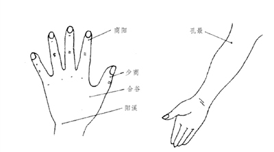有效穴位 合谷、孔最、少商、阳溪、商阳等穴(如图3、图4、图5和图6)。