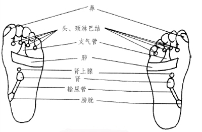 按摩手法 ①依次点按足部肾和肾上腺反射区各50~100次,向足跟方向点按, 以微微酸痛为宜,每日2次。②推按足部输尿管反射区30~50次,由足趾向足跟推按,用力要均匀,力量不要太大,以自觉酸胀为佳。③点按足部膀胱、鼻反射区各50~100次。④由足外侧向足内侧推按肺、支气管反射区各50~100次。