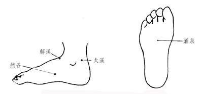按摩手法 单指扣拳,点按涌泉、解溪、然谷、太溪等穴,各50~100次,力度适中。