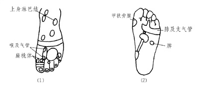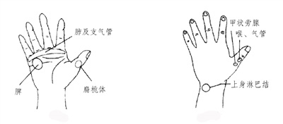 有效反射区 甲状旁腺、喉及气管、肺及支气管、上身淋巴结、扁桃体、脾等反射区(图9、图10)。