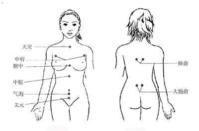 有效穴位 天突、膻中、中府、中脘、气海、关元、肺俞、大肠俞等穴位(图11、图12)。