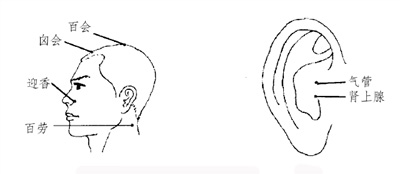 有效穴位 迎香、百会、囟会、百劳等穴,及气管、肾上腺等耳穴(如图1、图2)。