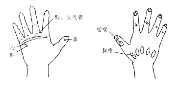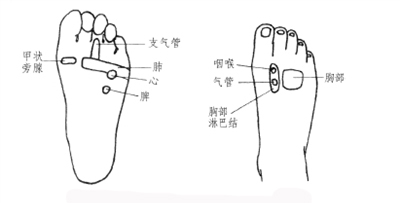 按摩手法 ①肺、支气管反射区每次各推压30~50次。②气管、咽喉反射区每次各按揉30~50次。③甲状旁腺、心、脾反射区每次各按揉30次。④胸部淋巴结反射区每次刮压30~50次。⑤ 胸部反射区每次各推压30次。