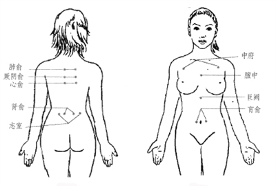 有效穴位 中府、膻中、巨阙、肓俞、肺俞、志室等穴位(图7、图8)。