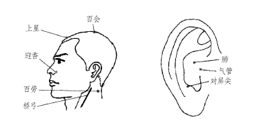 有效穴位 迎香、百会、上星、桥弓、百劳等穴,及肺、气管、对屏尖等耳穴。(图1、图2)