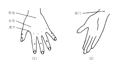有效穴位 合谷、神门、阳池、虎口等穴位(如图2、图3)。