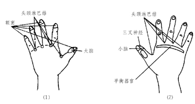 手部有效反射区 大脑、小脑、额窦、三叉神经、头颈淋巴结、平衡器官等。