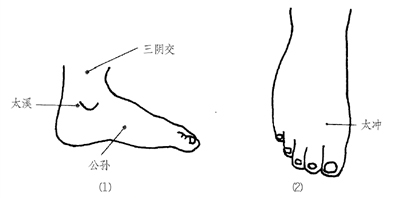 有效穴位 太冲、太溪、公孙、三阴交、涌泉等穴位(如图4、图5)。