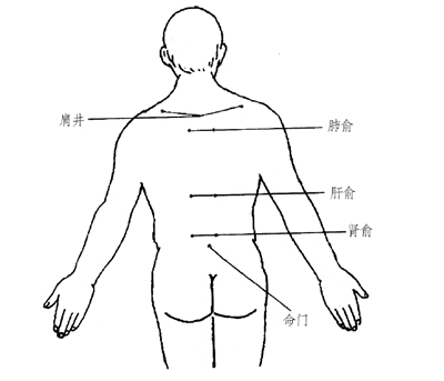 有效穴位 肩部的肩井穴,背部的肺俞、肝俞、肾俞、命门等穴(如图6)。