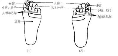 足部有效反射区 大脑、小脑、脑干、三叉神经、头颈淋巴结、垂体等。