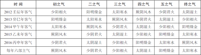 运气学说认为,五运六气能反映不同年之间的气候差异;主气每年是固定不变的;岁运和客气则是每年不同的。客气与主气同化,结合岁运相互生克制化形成了每年各节气中不同的气候变化规律。现就2012年至2016年运气特点做一次简单归纳,由于主气每年不变,故主要从岁运和客气进行探讨。从岁运来说,虽然所获资料时间较短,尚不足以对不同岁运年的资料作全面分析,但我们看到:雾霾最严重的2012年至2013年初是壬辰年,世界上最著名的伦敦大雾霾发生在1952年冬至1953年初,也是壬辰年。壬辰年年的运气格局:岁运木运太过,太阳寒水司天,太阴湿土在泉。相关的运气因子是风、寒、湿。从客气来看,从2012年至2016年各年的客气列表如下表。