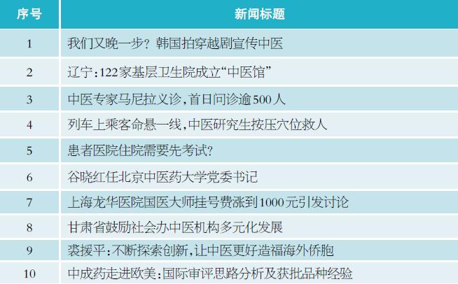 上一监测周期(8月26日~9月1日),韩国拍穿越剧宣传中医成为舆论关注热点。监测显示,微信平台共发布8449条中医药相关图文消息,总阅读量超过1608万人次。微博平台共有热门微博2535条。转载热度前十的新闻如图:
