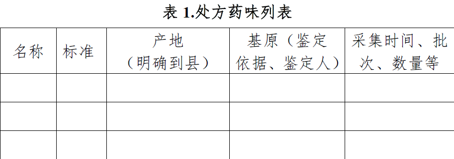 以列表的形式汇总处方中各个药味的来源、相关证明文件以及执行标准。相关示例如下: